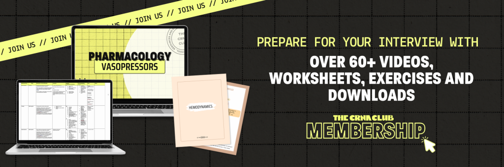 Want more CRNA School Interview tips? We’ve got templates and how-to videos inside of our Membership! Plus over 60+ pathophysiology, pharmacology and interview prep lectures by faculty!