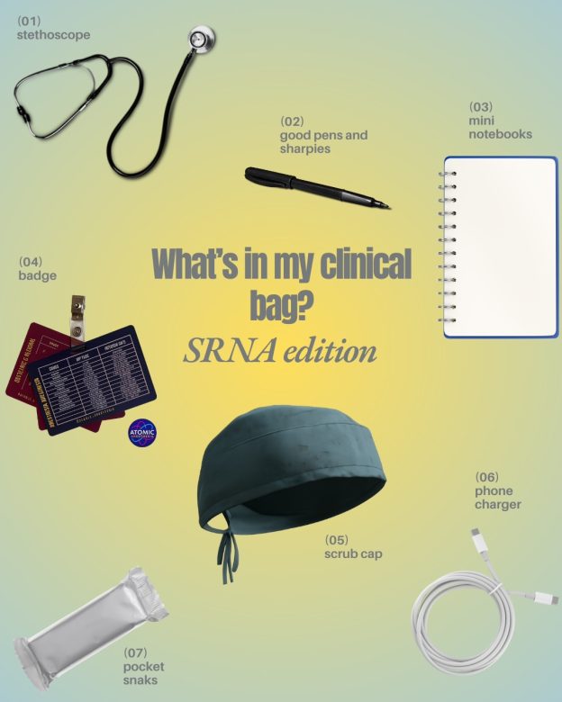 Fellow SRNAs, what are your go-to clinical bag essentials? Drop them in the comments!